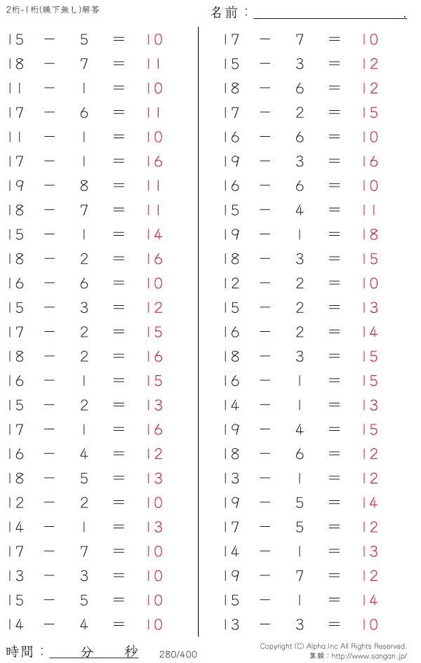 上記のボタンから「20未満-1桁(繰下無し)」の算数数学ドリル・計算ドリル(PDFプリント)がダウンロードできます。個人利用は無料です(家庭以外での配布は有料です)。