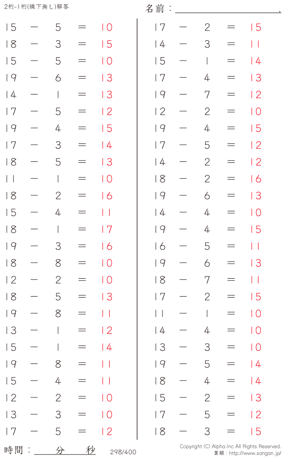 上記のボタンから「20未満-1桁(繰下無し)」の算数数学ドリル・計算ドリル(PDFプリント)がダウンロードできます。個人利用は無料です(家庭以外での配布は有料です)。