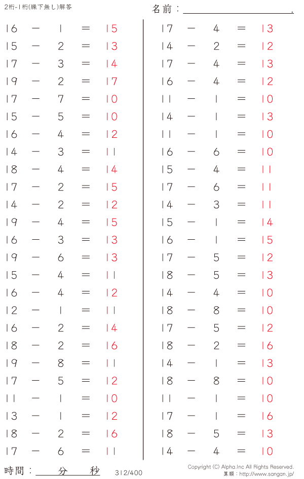 上記のボタンから「20未満-1桁(繰下無し)」の算数数学ドリル・計算ドリル(PDFプリント)がダウンロードできます。個人利用は無料です(家庭以外での配布は有料です)。