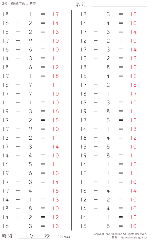 上記のボタンから「20未満-1桁(繰下無し)」の算数数学ドリル・計算ドリル(PDFプリント)がダウンロードできます。個人利用は無料です(家庭以外での配布は有料です)。
