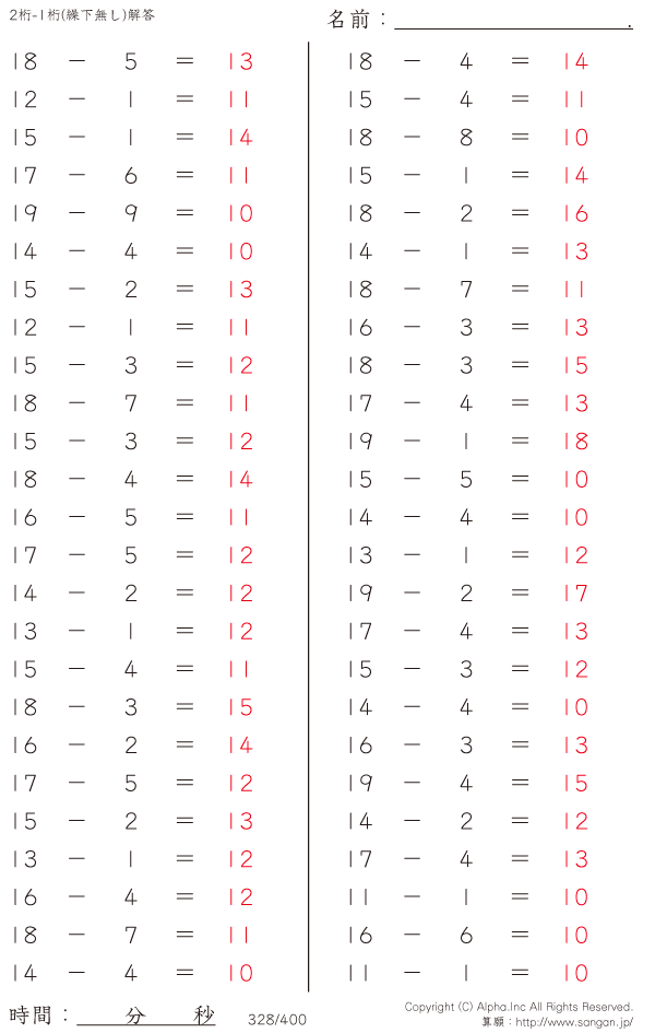 上記のボタンから「20未満-1桁(繰下無し)」の算数数学ドリル・計算ドリル(PDFプリント)がダウンロードできます。個人利用は無料です(家庭以外での配布は有料です)。