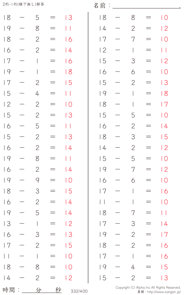 上記のボタンから「20未満-1桁(繰下無し)」の算数数学ドリル・計算ドリル(PDFプリント)がダウンロードできます。個人利用は無料です(家庭以外での配布は有料です)。