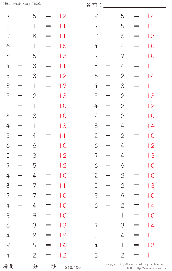 上記のボタンから「20未満-1桁(繰下無し)」の算数数学ドリル・計算ドリル(PDFプリント)がダウンロードできます。個人利用は無料です(家庭以外での配布は有料です)。