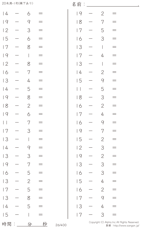 上記のボタンから「20未満の2桁-1桁」の算数数学ドリル・計算ドリル(PDFプリント)がダウンロードできます。個人利用は無料です(家庭以外での配布は有料です)。
