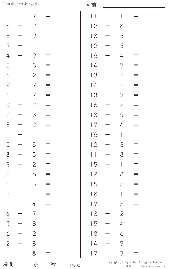 上記のボタンから「20未満の2桁-1桁」の算数数学ドリル・計算ドリル(PDFプリント)がダウンロードできます。個人利用は無料です(家庭以外での配布は有料です)。