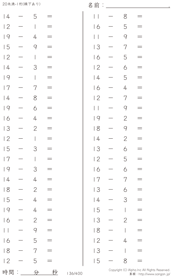 上記のボタンから「20未満の2桁-1桁」の算数数学ドリル・計算ドリル(PDFプリント)がダウンロードできます。個人利用は無料です(家庭以外での配布は有料です)。