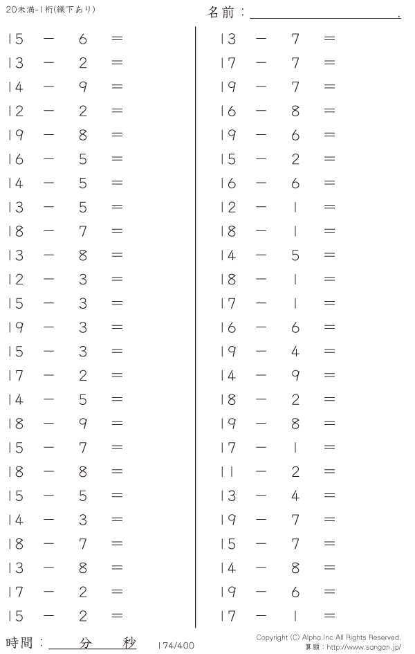 上記のボタンから「20未満の2桁-1桁」の算数数学ドリル・計算ドリル(PDFプリント)がダウンロードできます。個人利用は無料です(家庭以外での配布は有料です)。