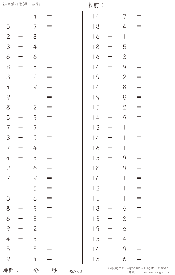 上記のボタンから「20未満の2桁-1桁」の算数数学ドリル・計算ドリル(PDFプリント)がダウンロードできます。個人利用は無料です(家庭以外での配布は有料です)。