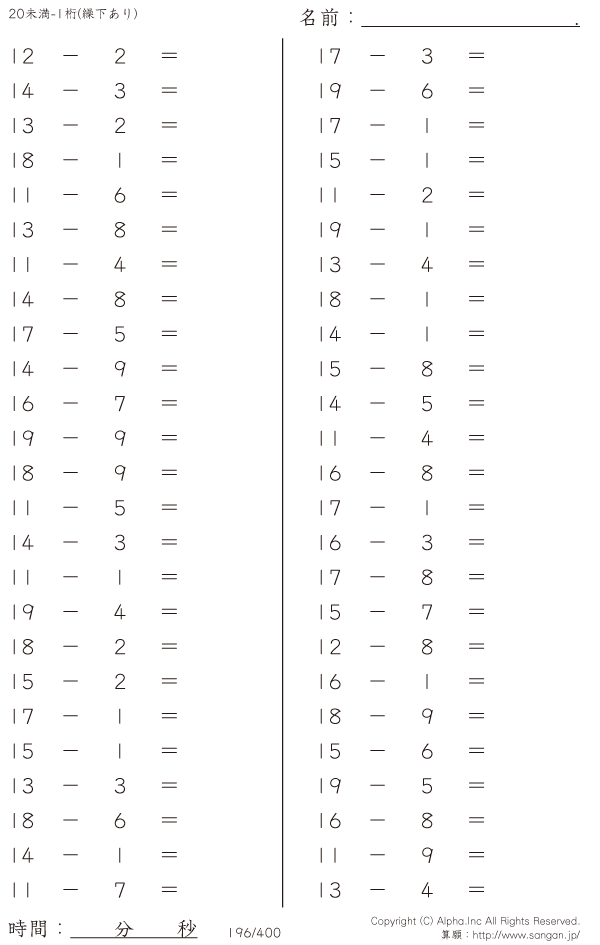 20未満の2桁-1桁 [問題]196/400
