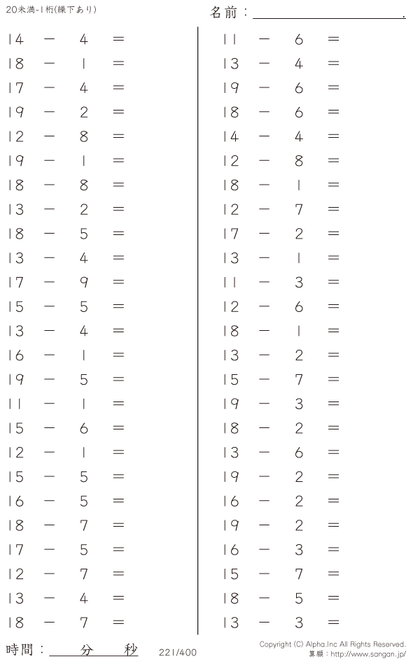 上記のボタンから「20未満の2桁-1桁」の算数数学ドリル・計算ドリル(PDFプリント)がダウンロードできます。個人利用は無料です(家庭以外での配布は有料です)。