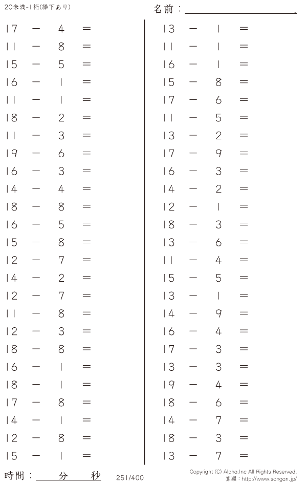 上記のボタンから「20未満の2桁-1桁」の算数数学ドリル・計算ドリル(PDFプリント)がダウンロードできます。個人利用は無料です(家庭以外での配布は有料です)。