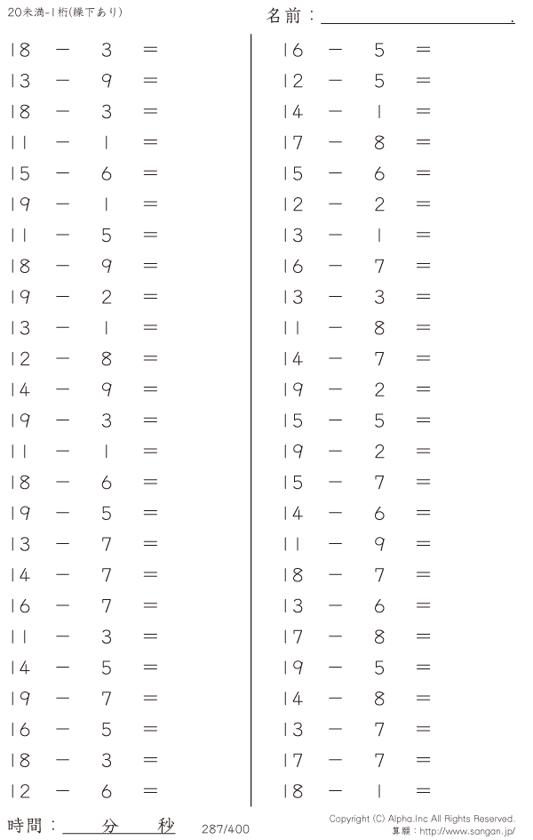 上記のボタンから「20未満の2桁-1桁」の算数数学ドリル・計算ドリル(PDFプリント)がダウンロードできます。個人利用は無料です(家庭以外での配布は有料です)。