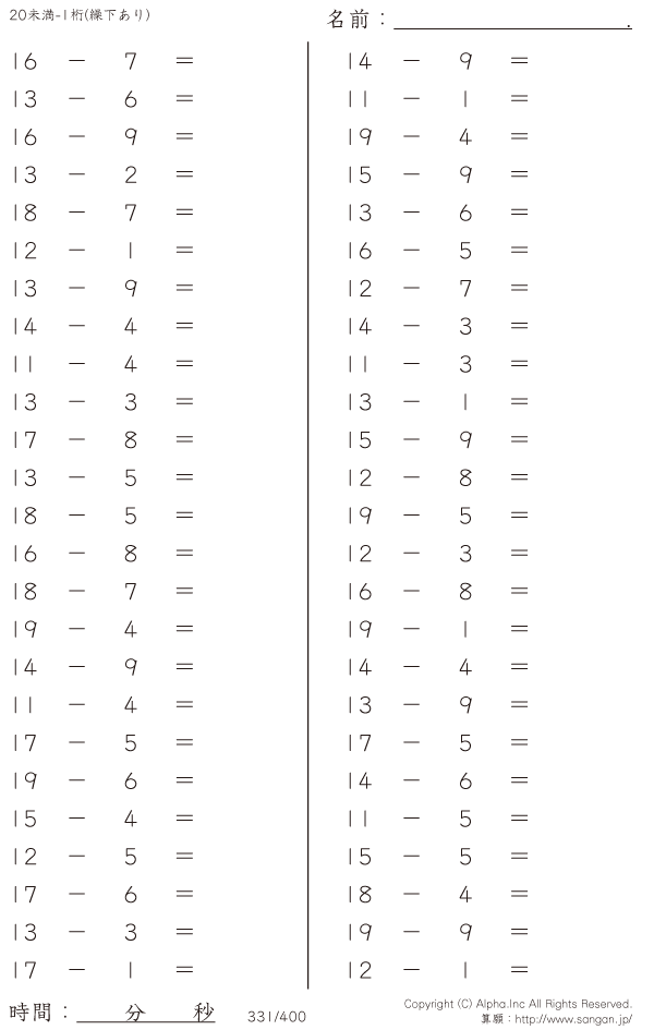 上記のボタンから「20未満の2桁-1桁」の算数数学ドリル・計算ドリル(PDFプリント)がダウンロードできます。個人利用は無料です(家庭以外での配布は有料です)。