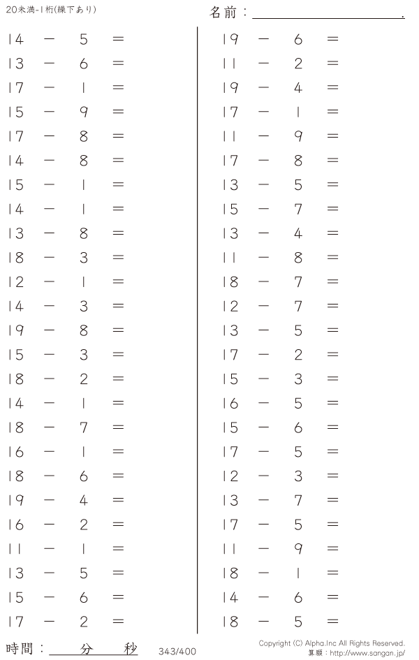 上記のボタンから「20未満の2桁-1桁」の算数数学ドリル・計算ドリル(PDFプリント)がダウンロードできます。個人利用は無料です(家庭以外での配布は有料です)。