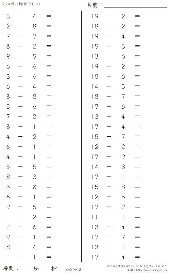 上記のボタンから「20未満の2桁-1桁」の算数数学ドリル・計算ドリル(PDFプリント)がダウンロードできます。個人利用は無料です(家庭以外での配布は有料です)。