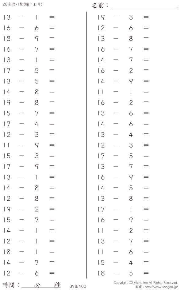 上記のボタンから「20未満の2桁-1桁」の算数数学ドリル・計算ドリル(PDFプリント)がダウンロードできます。個人利用は無料です(家庭以外での配布は有料です)。