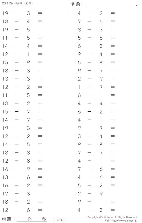 上記のボタンから「20未満の2桁-1桁」の算数数学ドリル・計算ドリル(PDFプリント)がダウンロードできます。個人利用は無料です(家庭以外での配布は有料です)。