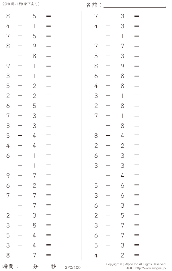 上記のボタンから「20未満の2桁-1桁」の算数数学ドリル・計算ドリル(PDFプリント)がダウンロードできます。個人利用は無料です(家庭以外での配布は有料です)。