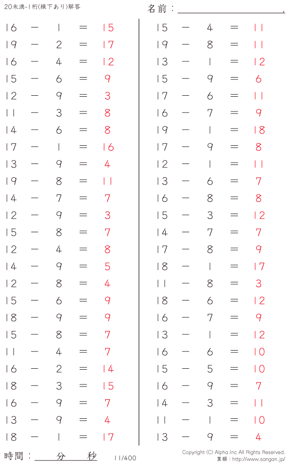 上記のボタンから「20未満の2桁-1桁」の算数数学ドリル・計算ドリル(PDFプリント)がダウンロードできます。個人利用は無料です(家庭以外での配布は有料です)。