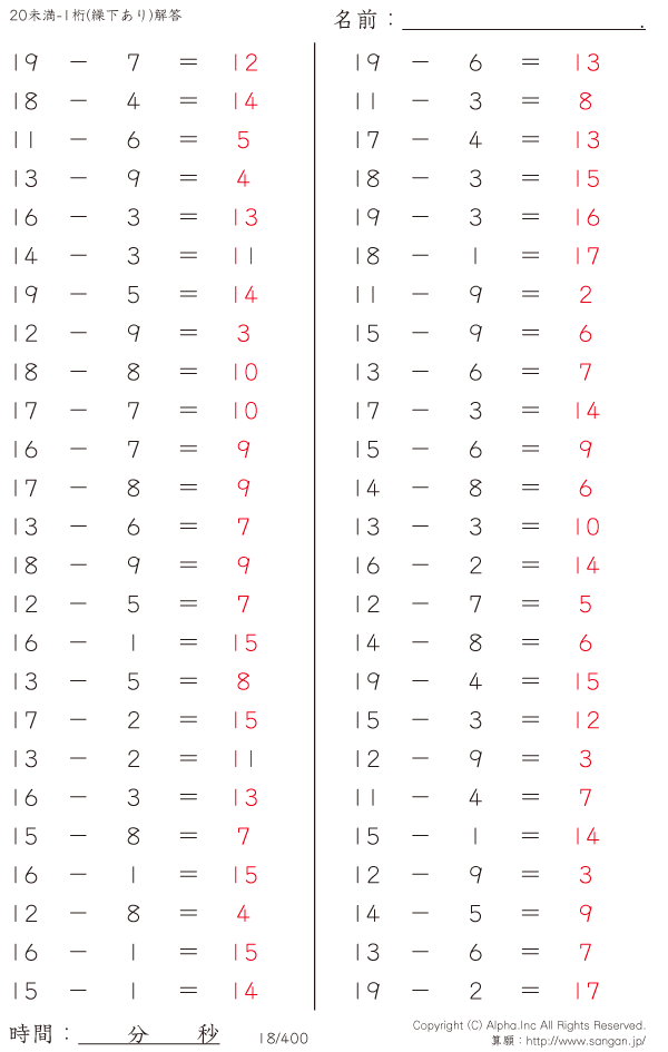 20未満の2桁-1桁 [解答]018/400