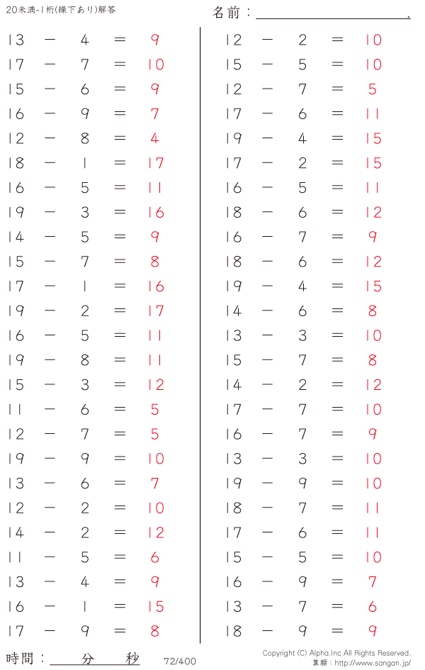 20未満の2桁-1桁 [解答]072/400
