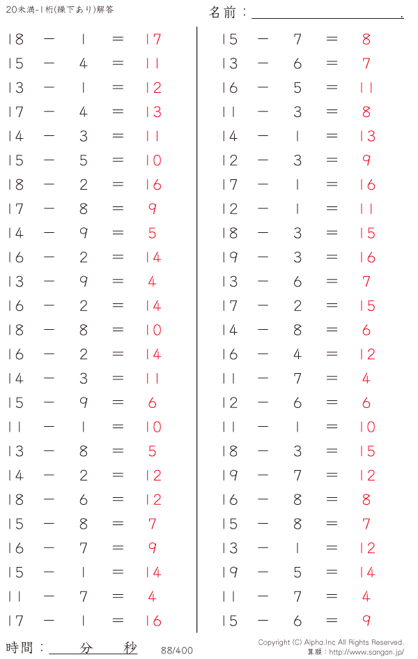 上記のボタンから「20未満の2桁-1桁」の算数数学ドリル・計算ドリル(PDFプリント)がダウンロードできます。個人利用は無料です(家庭以外での配布は有料です)。