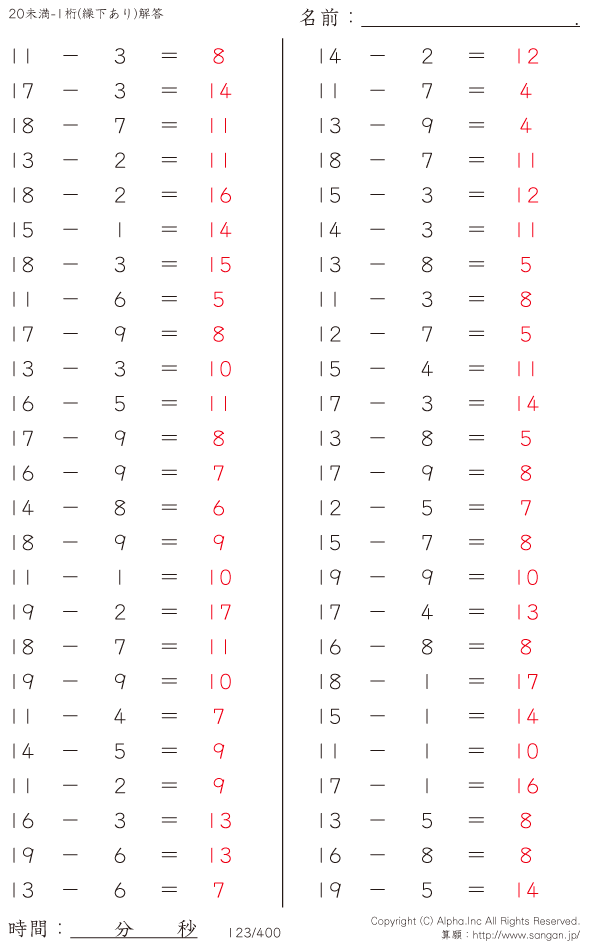 上記のボタンから「20未満の2桁-1桁」の算数数学ドリル・計算ドリル(PDFプリント)がダウンロードできます。個人利用は無料です(家庭以外での配布は有料です)。