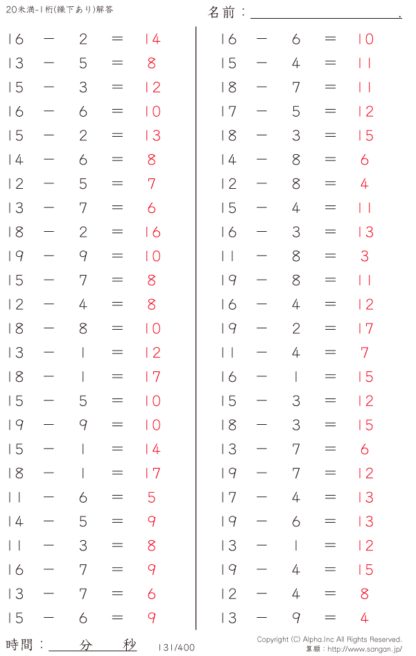 上記のボタンから「20未満の2桁-1桁」の算数数学ドリル・計算ドリル(PDFプリント)がダウンロードできます。個人利用は無料です(家庭以外での配布は有料です)。