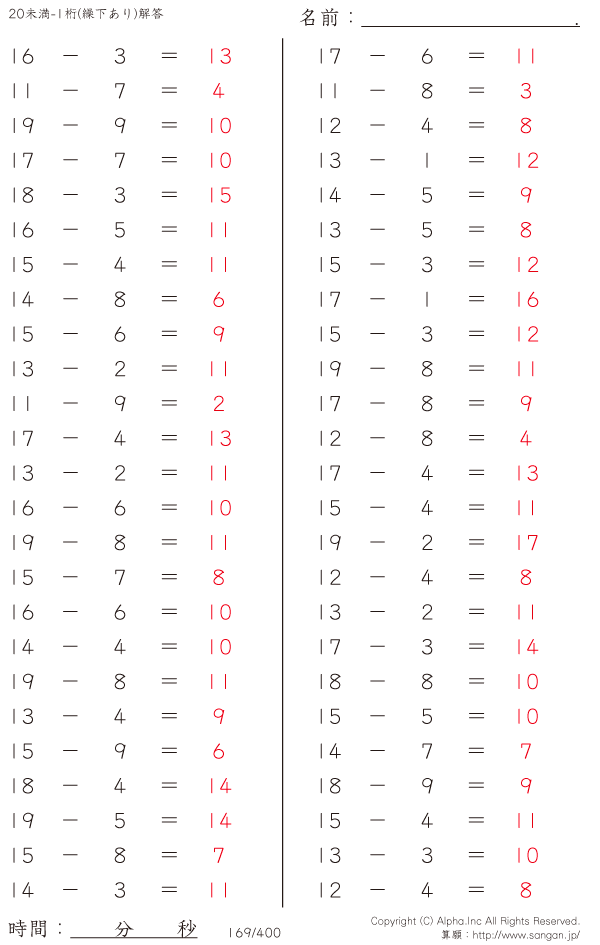 上記のボタンから「20未満の2桁-1桁」の算数数学ドリル・計算ドリル(PDFプリント)がダウンロードできます。個人利用は無料です(家庭以外での配布は有料です)。