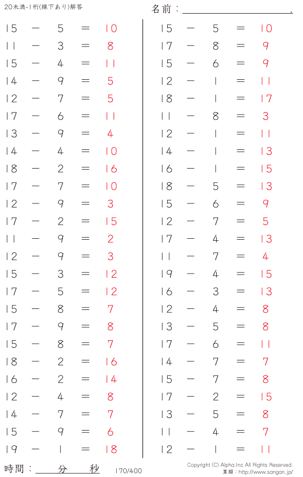 上記のボタンから「20未満の2桁-1桁」の算数数学ドリル・計算ドリル(PDFプリント)がダウンロードできます。個人利用は無料です(家庭以外での配布は有料です)。