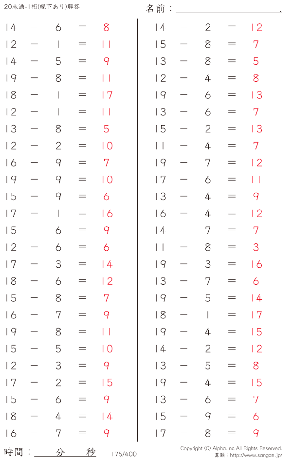 20未満の2桁-1桁 [解答]175/400