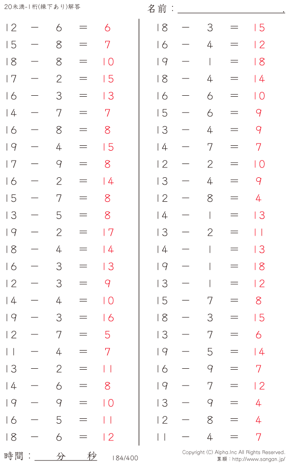 20未満の2桁-1桁 [解答]184/400