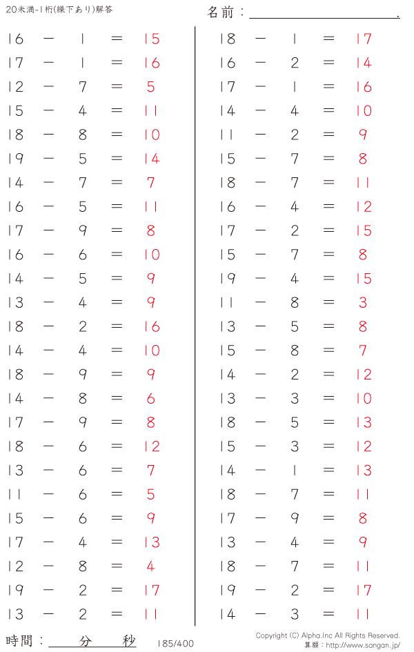 20未満の2桁-1桁 [解答]185/400