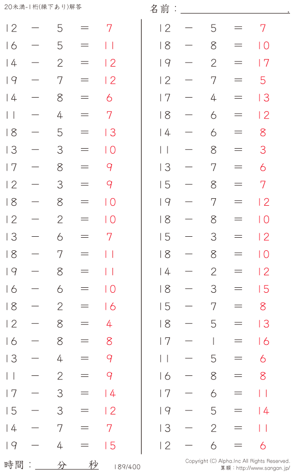上記のボタンから「20未満の2桁-1桁」の算数数学ドリル・計算ドリル(PDFプリント)がダウンロードできます。個人利用は無料です(家庭以外での配布は有料です)。