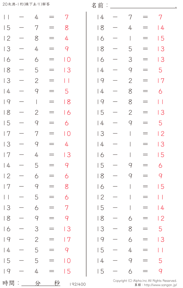 上記のボタンから「20未満の2桁-1桁」の算数数学ドリル・計算ドリル(PDFプリント)がダウンロードできます。個人利用は無料です(家庭以外での配布は有料です)。