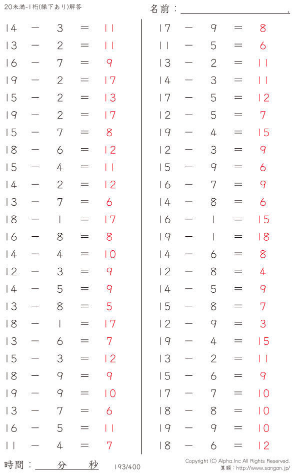 上記のボタンから「20未満の2桁-1桁」の算数数学ドリル・計算ドリル(PDFプリント)がダウンロードできます。個人利用は無料です(家庭以外での配布は有料です)。