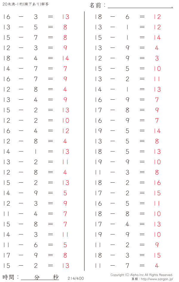 上記のボタンから「20未満の2桁-1桁」の算数数学ドリル・計算ドリル(PDFプリント)がダウンロードできます。個人利用は無料です(家庭以外での配布は有料です)。