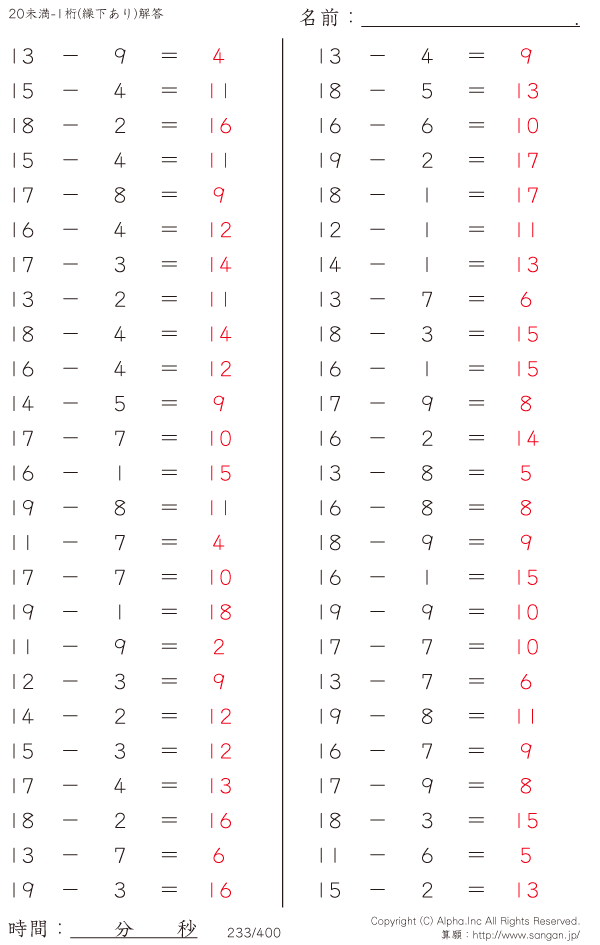 上記のボタンから「20未満の2桁-1桁」の算数数学ドリル・計算ドリル(PDFプリント)がダウンロードできます。個人利用は無料です(家庭以外での配布は有料です)。