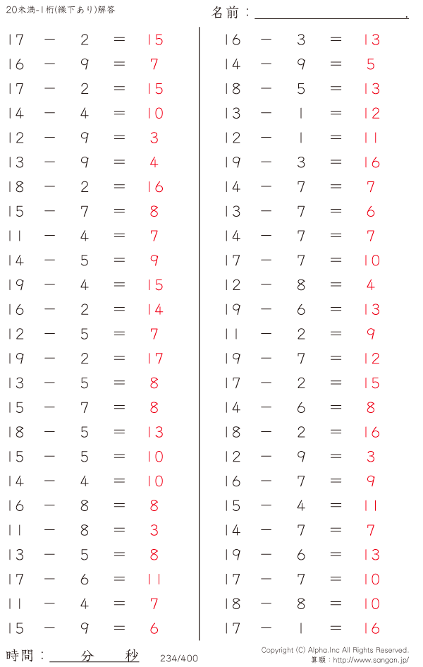 上記のボタンから「20未満の2桁-1桁」の算数数学ドリル・計算ドリル(PDFプリント)がダウンロードできます。個人利用は無料です(家庭以外での配布は有料です)。