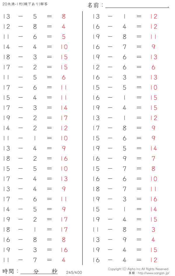 上記のボタンから「20未満の2桁-1桁」の算数数学ドリル・計算ドリル(PDFプリント)がダウンロードできます。個人利用は無料です(家庭以外での配布は有料です)。