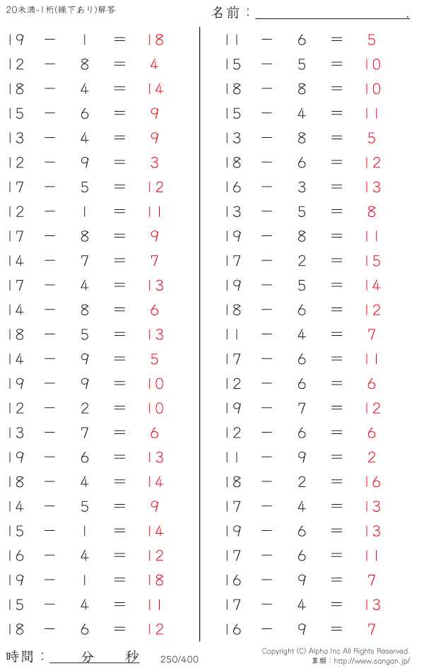 上記のボタンから「20未満の2桁-1桁」の算数数学ドリル・計算ドリル(PDFプリント)がダウンロードできます。個人利用は無料です(家庭以外での配布は有料です)。