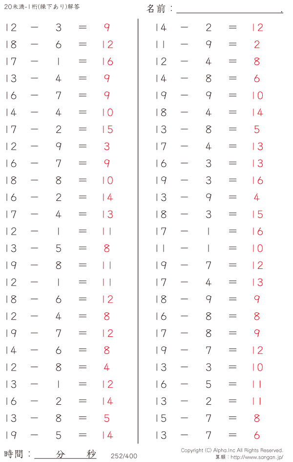 上記のボタンから「20未満の2桁-1桁」の算数数学ドリル・計算ドリル(PDFプリント)がダウンロードできます。個人利用は無料です(家庭以外での配布は有料です)。