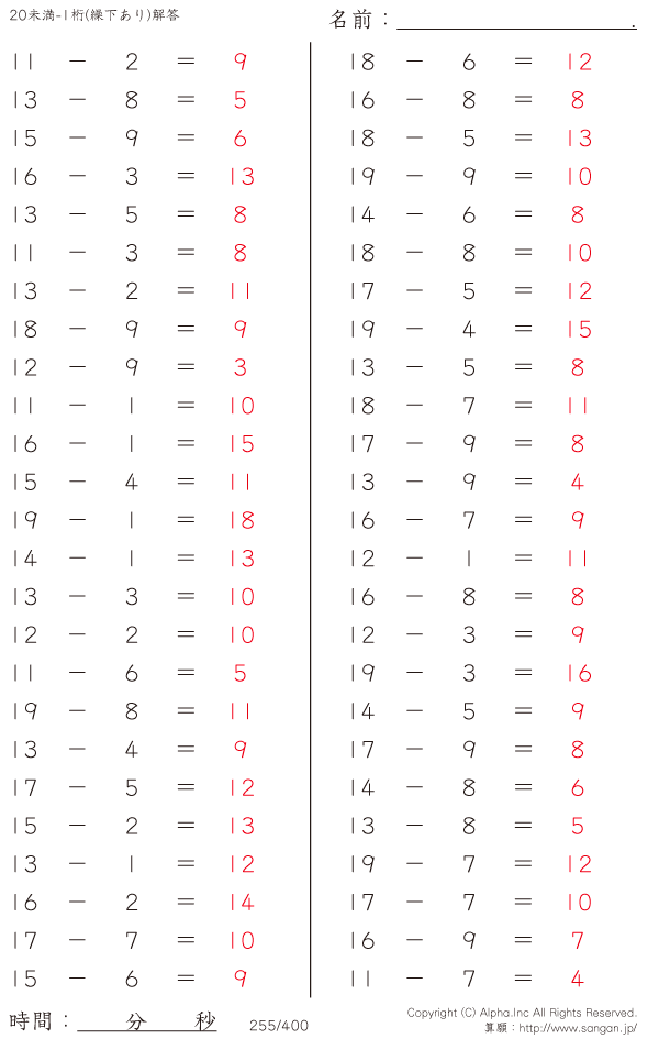 上記のボタンから「20未満の2桁-1桁」の算数数学ドリル・計算ドリル(PDFプリント)がダウンロードできます。個人利用は無料です(家庭以外での配布は有料です)。