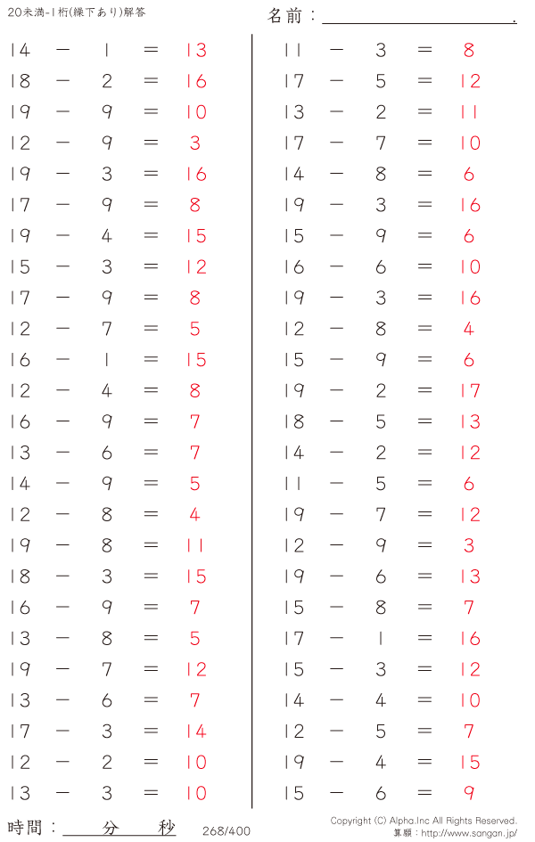 上記のボタンから「20未満の2桁-1桁」の算数数学ドリル・計算ドリル(PDFプリント)がダウンロードできます。個人利用は無料です(家庭以外での配布は有料です)。