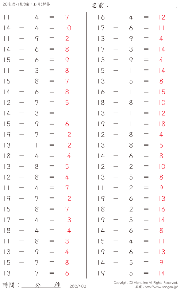 上記のボタンから「20未満の2桁-1桁」の算数数学ドリル・計算ドリル(PDFプリント)がダウンロードできます。個人利用は無料です(家庭以外での配布は有料です)。