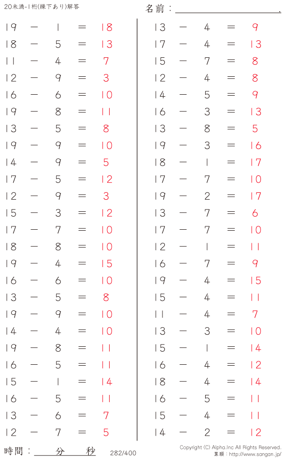 上記のボタンから「20未満の2桁-1桁」の算数数学ドリル・計算ドリル(PDFプリント)がダウンロードできます。個人利用は無料です(家庭以外での配布は有料です)。