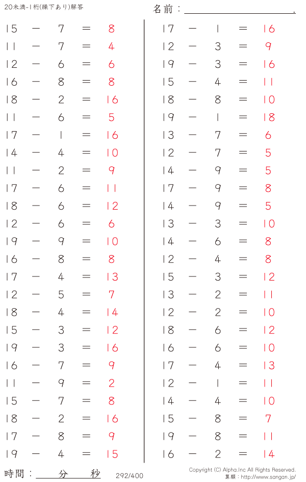20未満の2桁-1桁 [解答]292/400