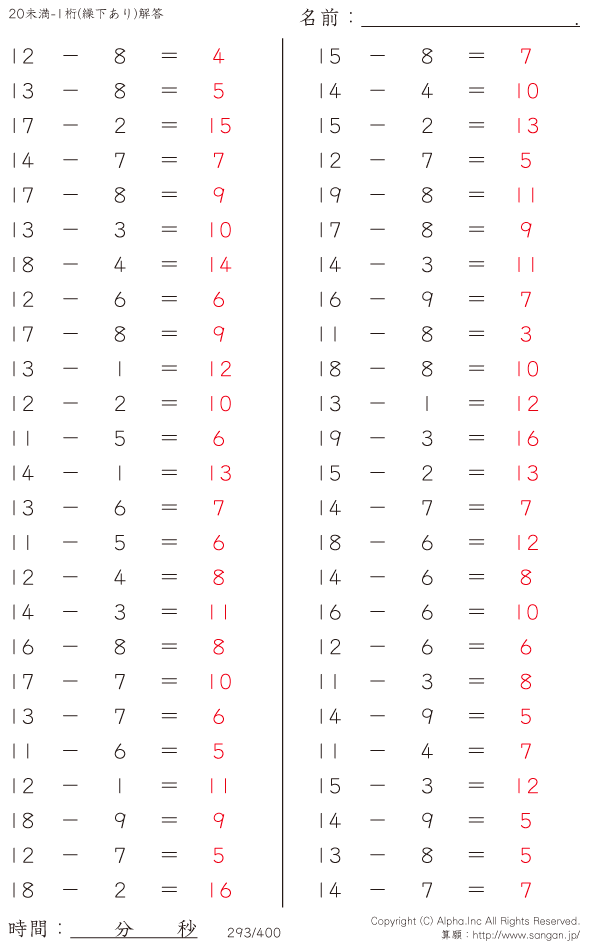 20未満の2桁-1桁 [解答]293/400