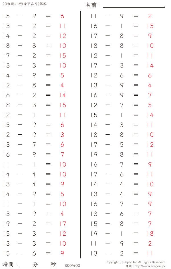 上記のボタンから「20未満の2桁-1桁」の算数数学ドリル・計算ドリル(PDFプリント)がダウンロードできます。個人利用は無料です(家庭以外での配布は有料です)。
