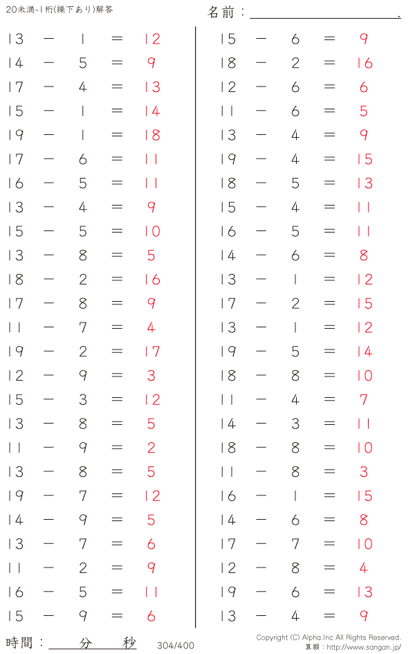 上記のボタンから「20未満の2桁-1桁」の算数数学ドリル・計算ドリル(PDFプリント)がダウンロードできます。個人利用は無料です(家庭以外での配布は有料です)。